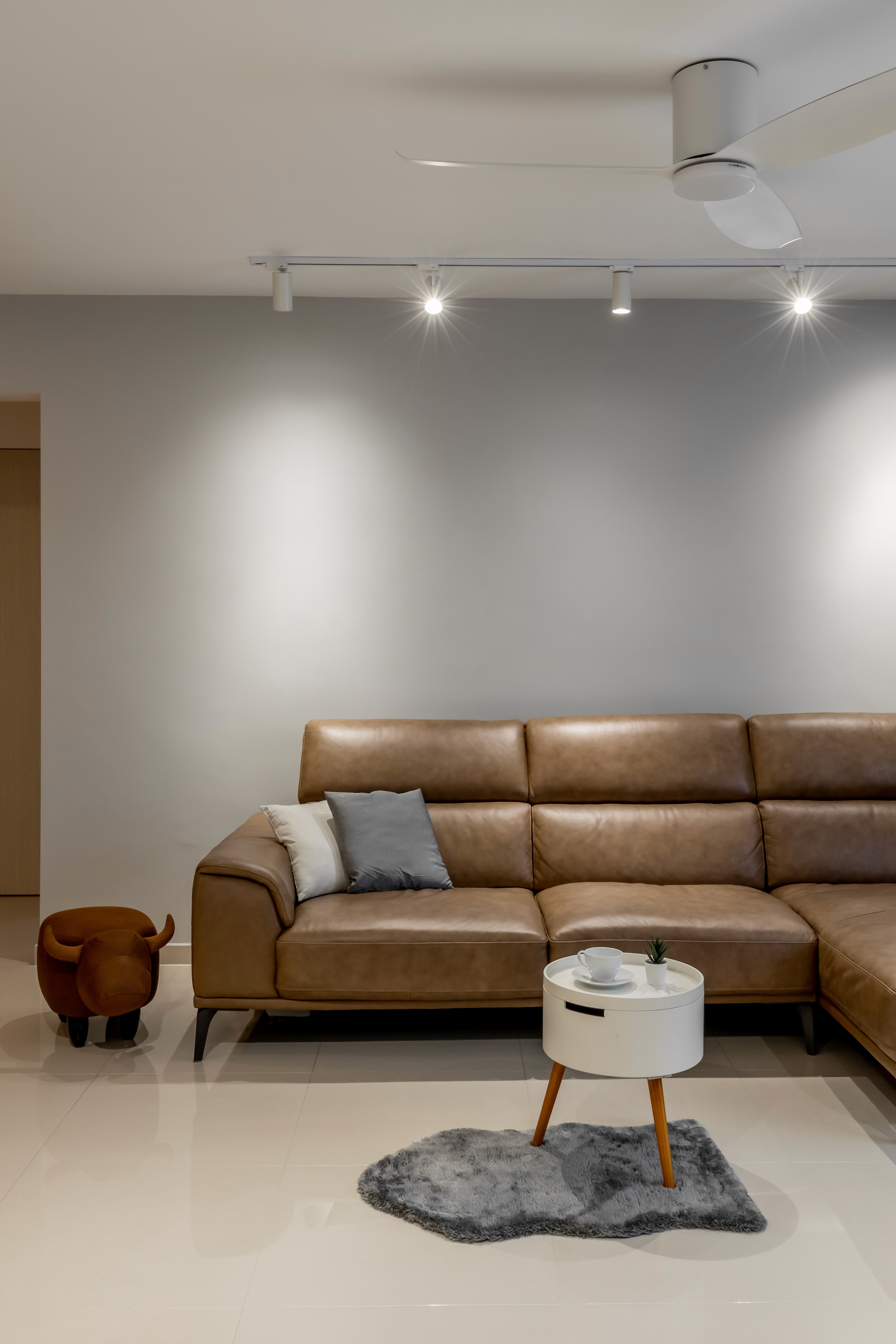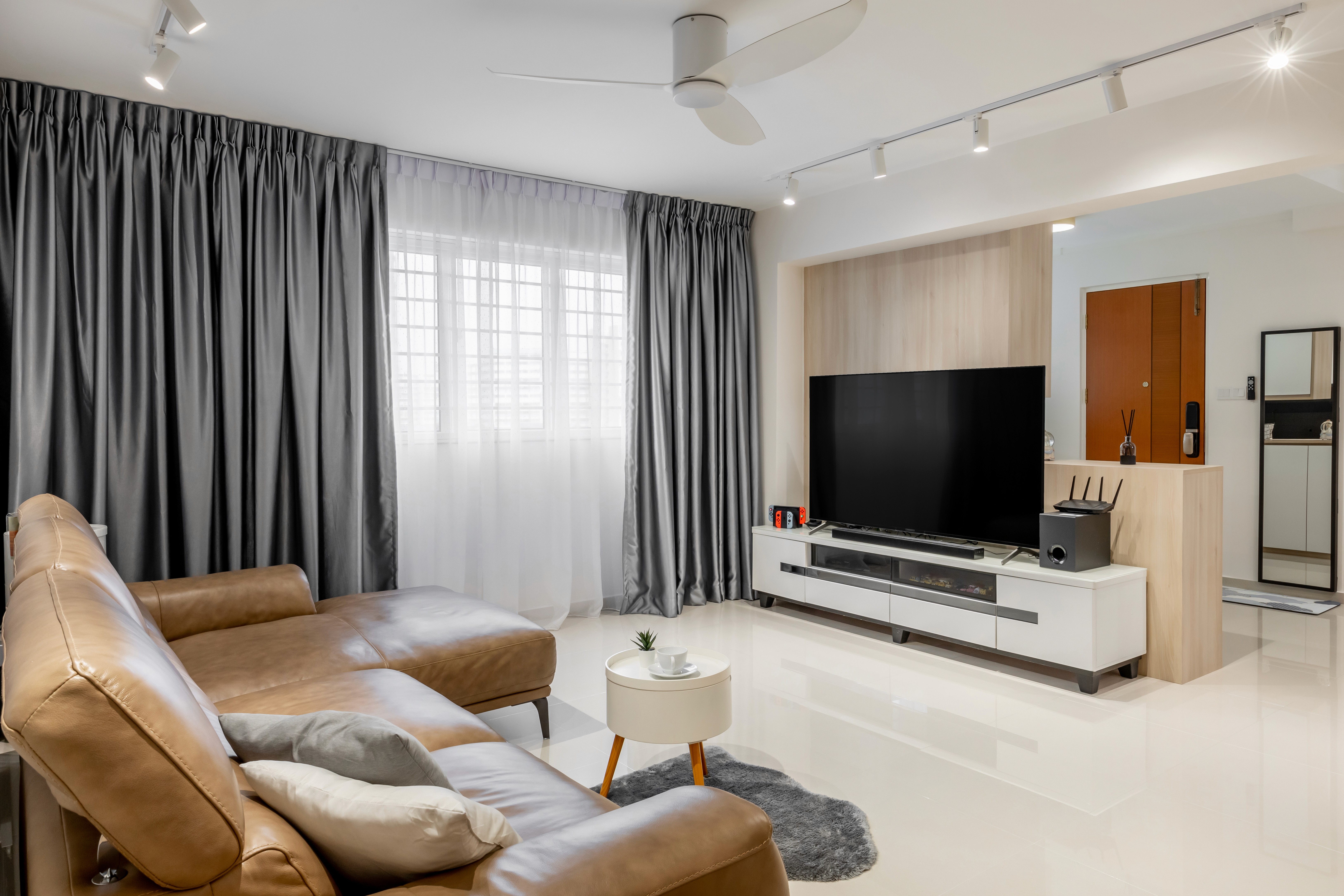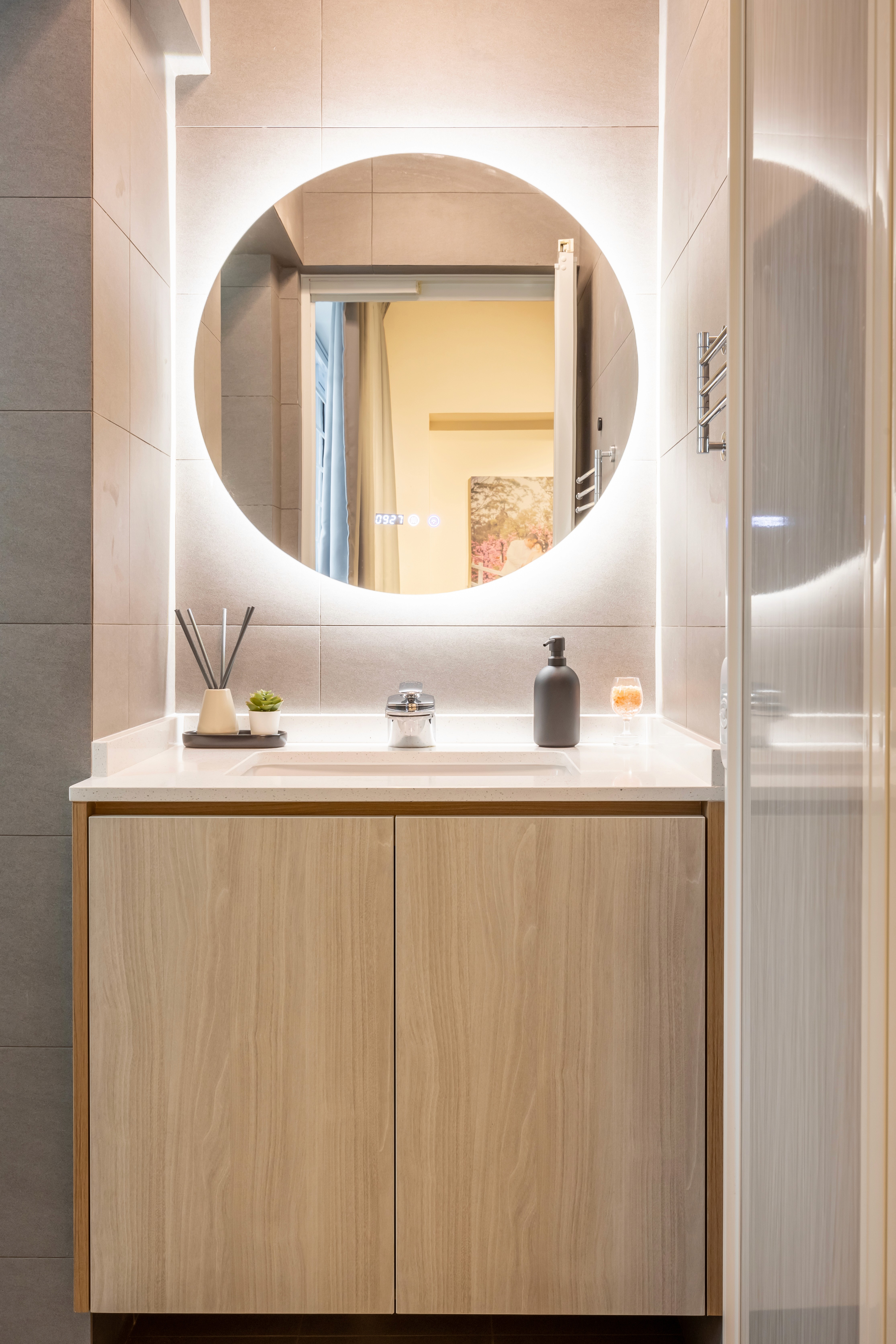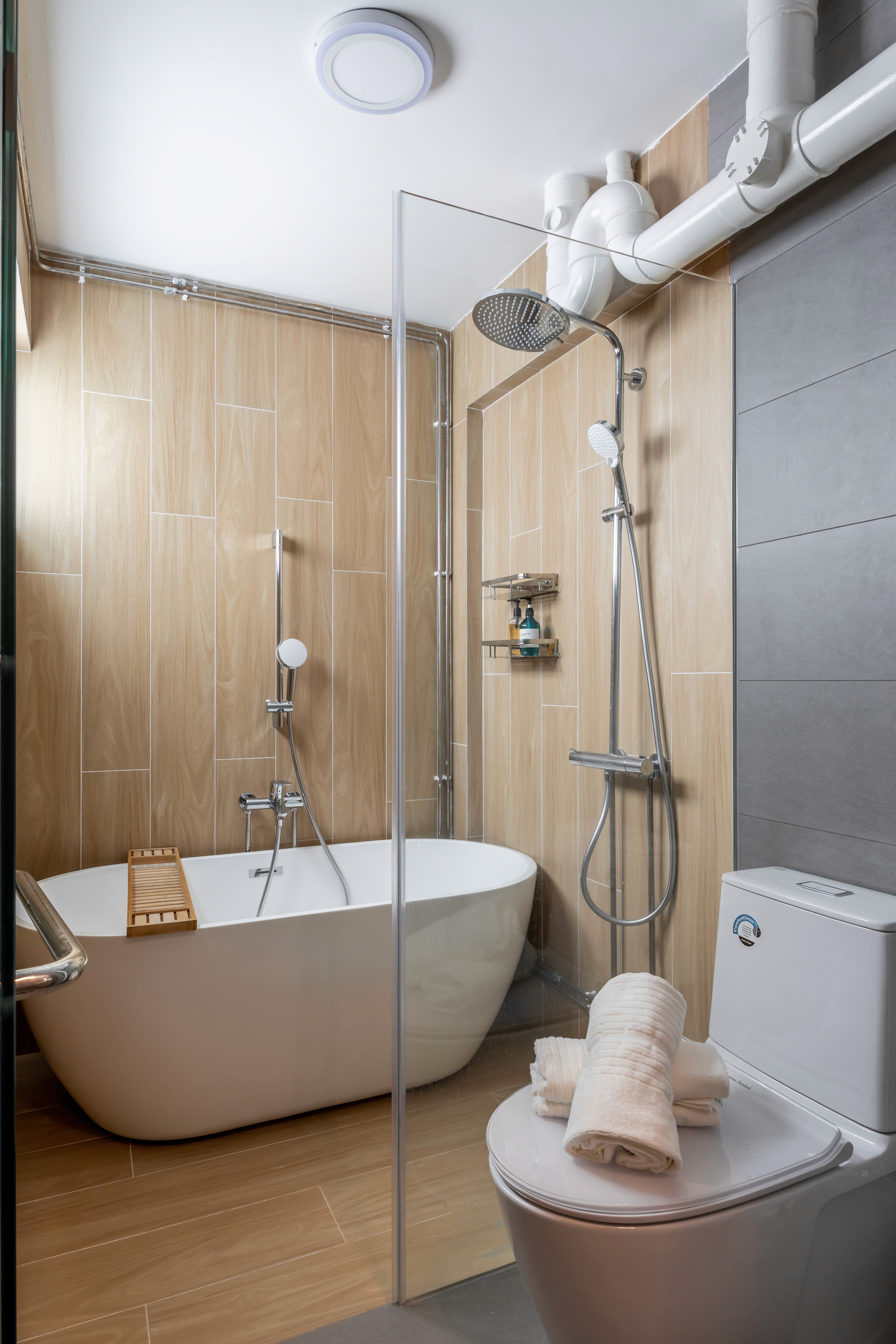 A highlight is the bathroom retreat, featuring a freestanding bathtub surrounded by soft wooden accents and contrasting dark grey tiles, offering the perfect spot to relax after a long workday. Every detail balances style, comfort, and functionality for a harmonious, tranquil home.
