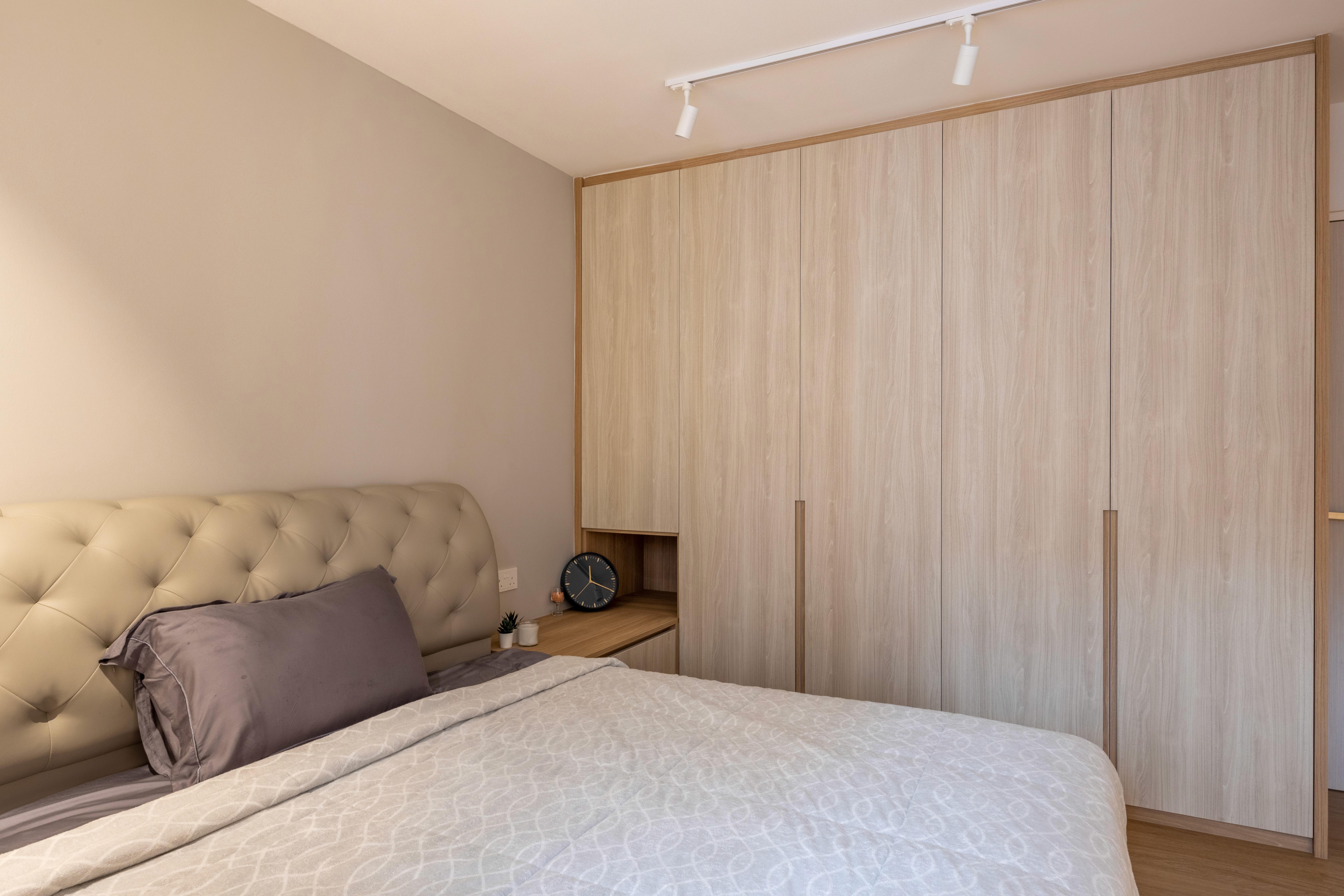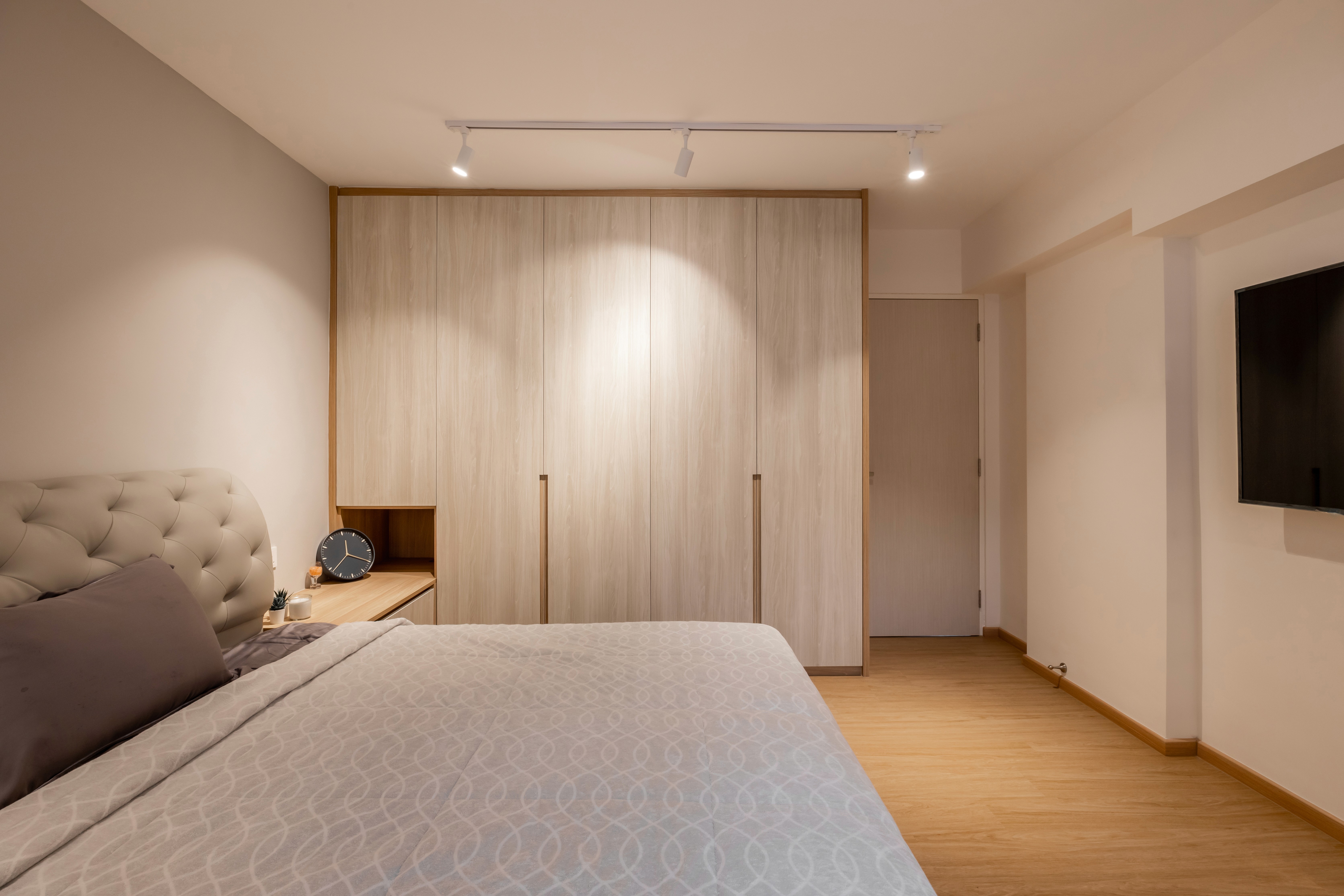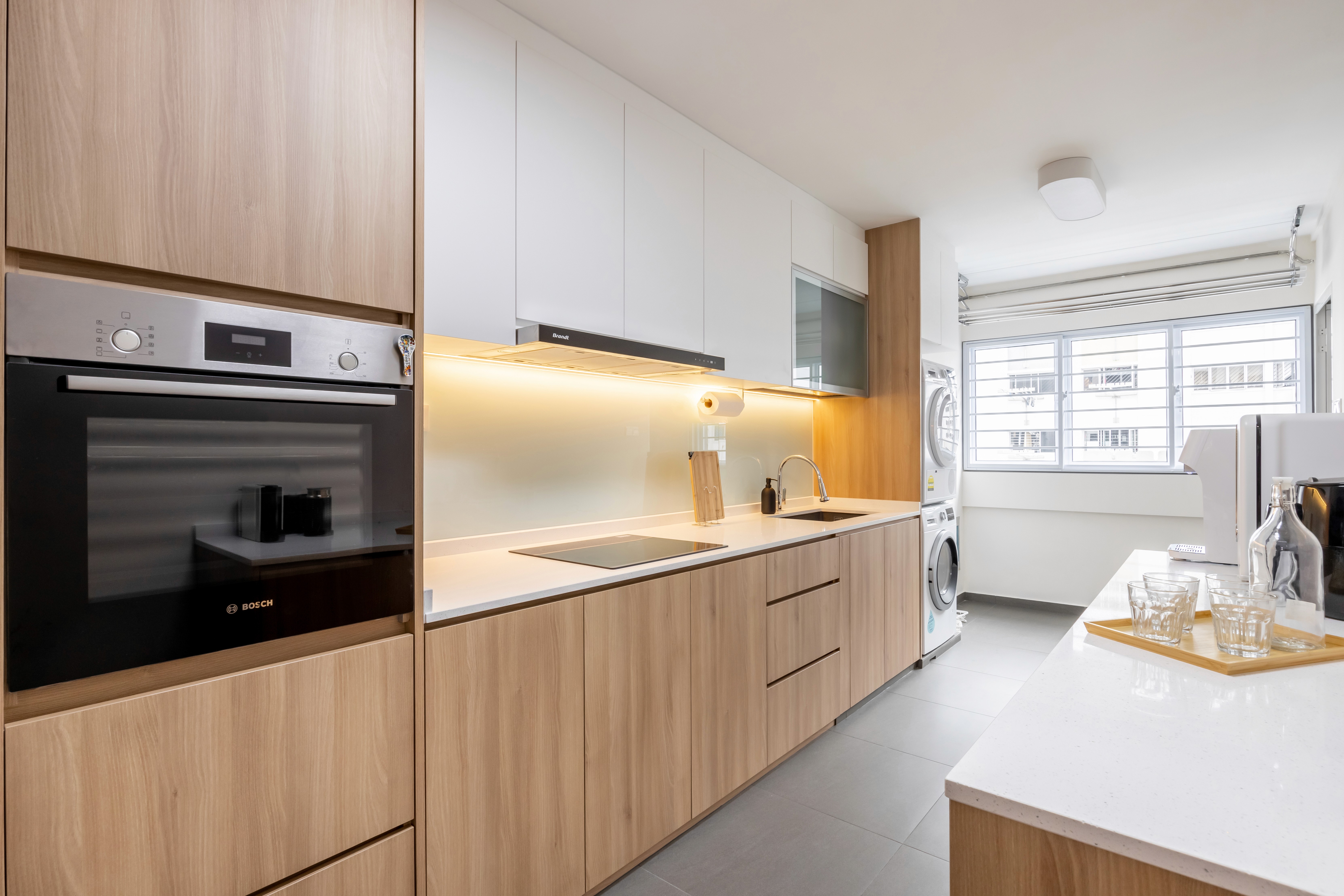 A minimalist palette of crisp white and natural light wood grains creates a bright, warm, and inviting space. Sunlight reflects off white surfaces, enhancing openness, while light wood cabinetry, and accents add warmth and texture. The design and layout are practical and easy to maintain, with seamless storage keeping spaces clutter-free and serene.