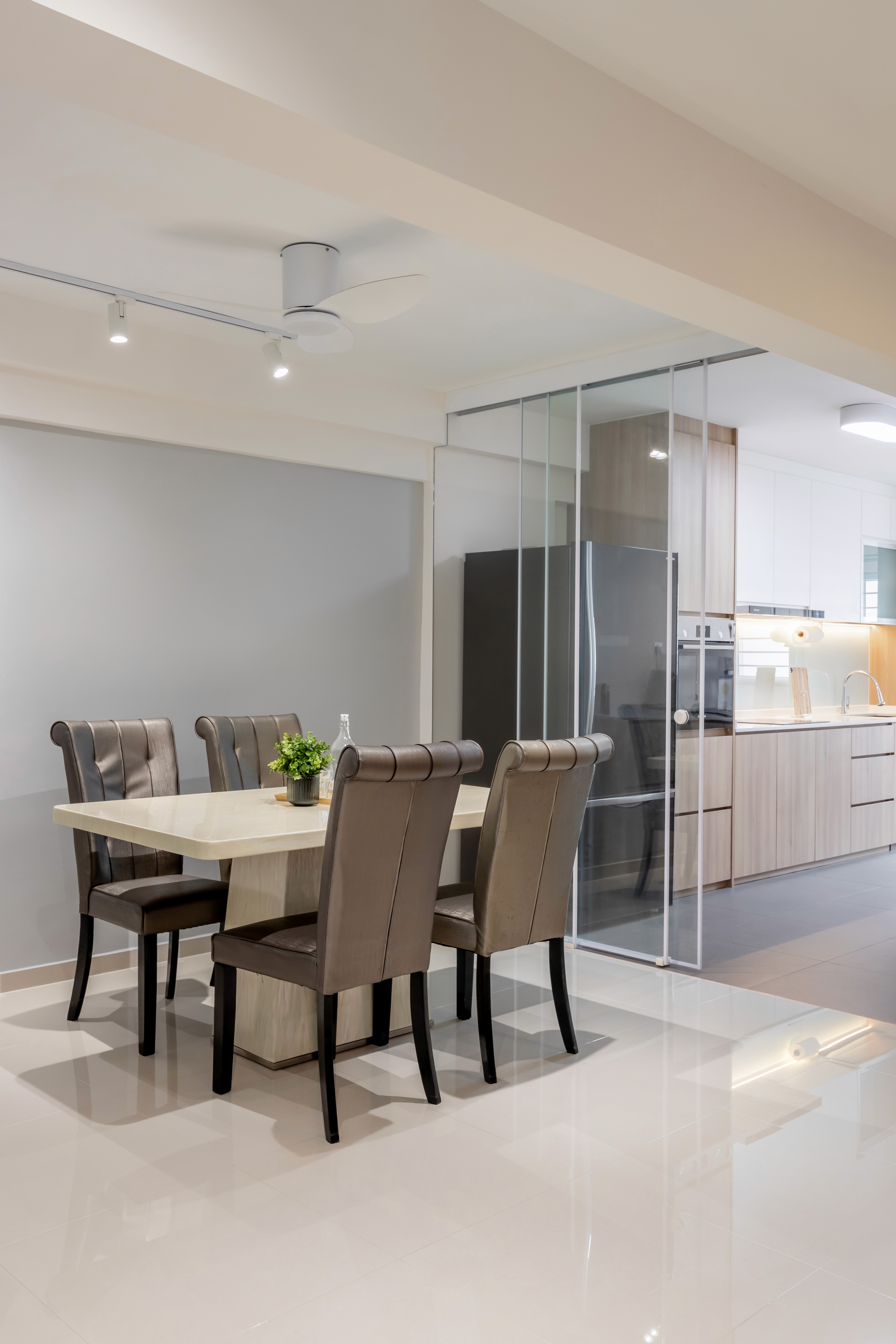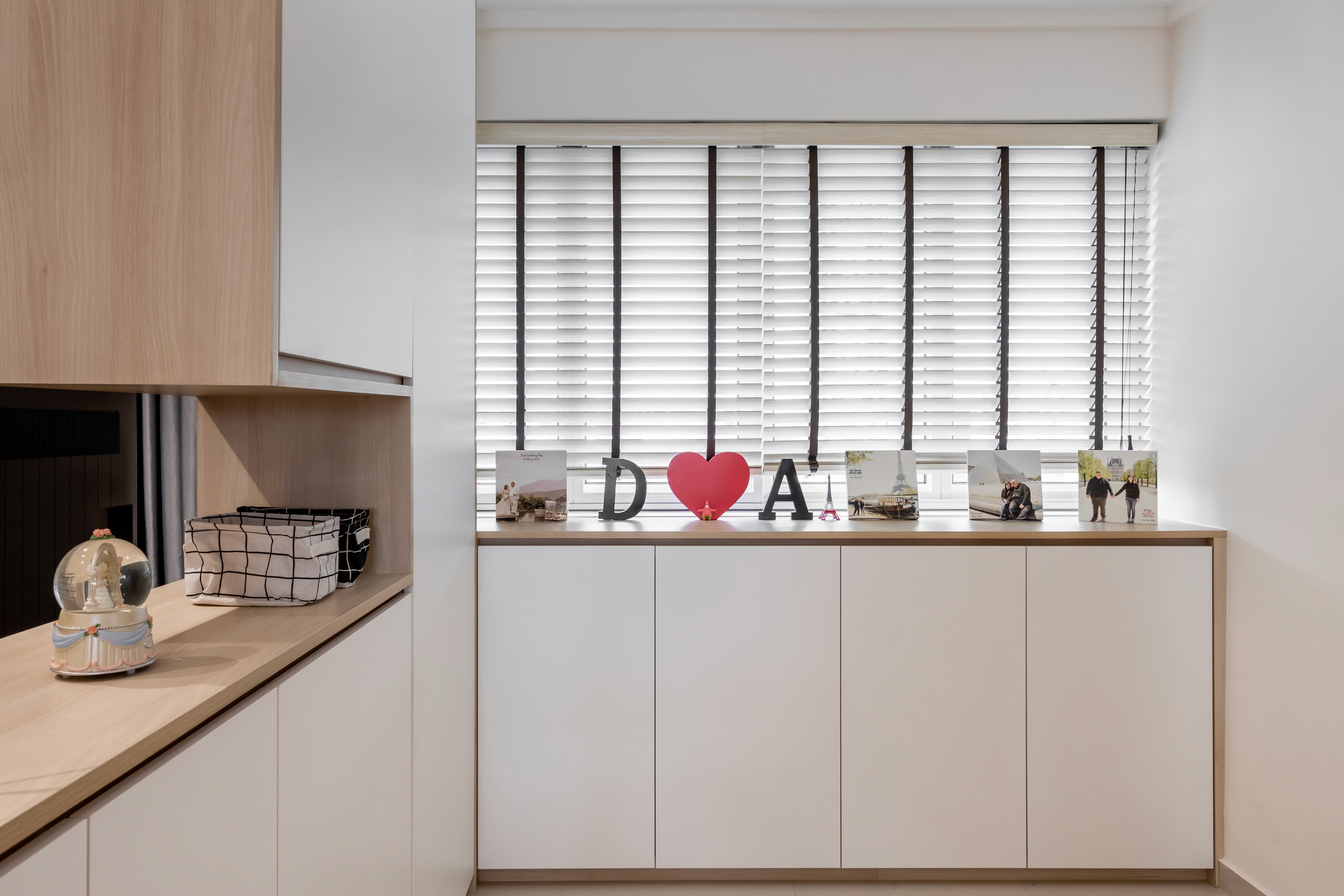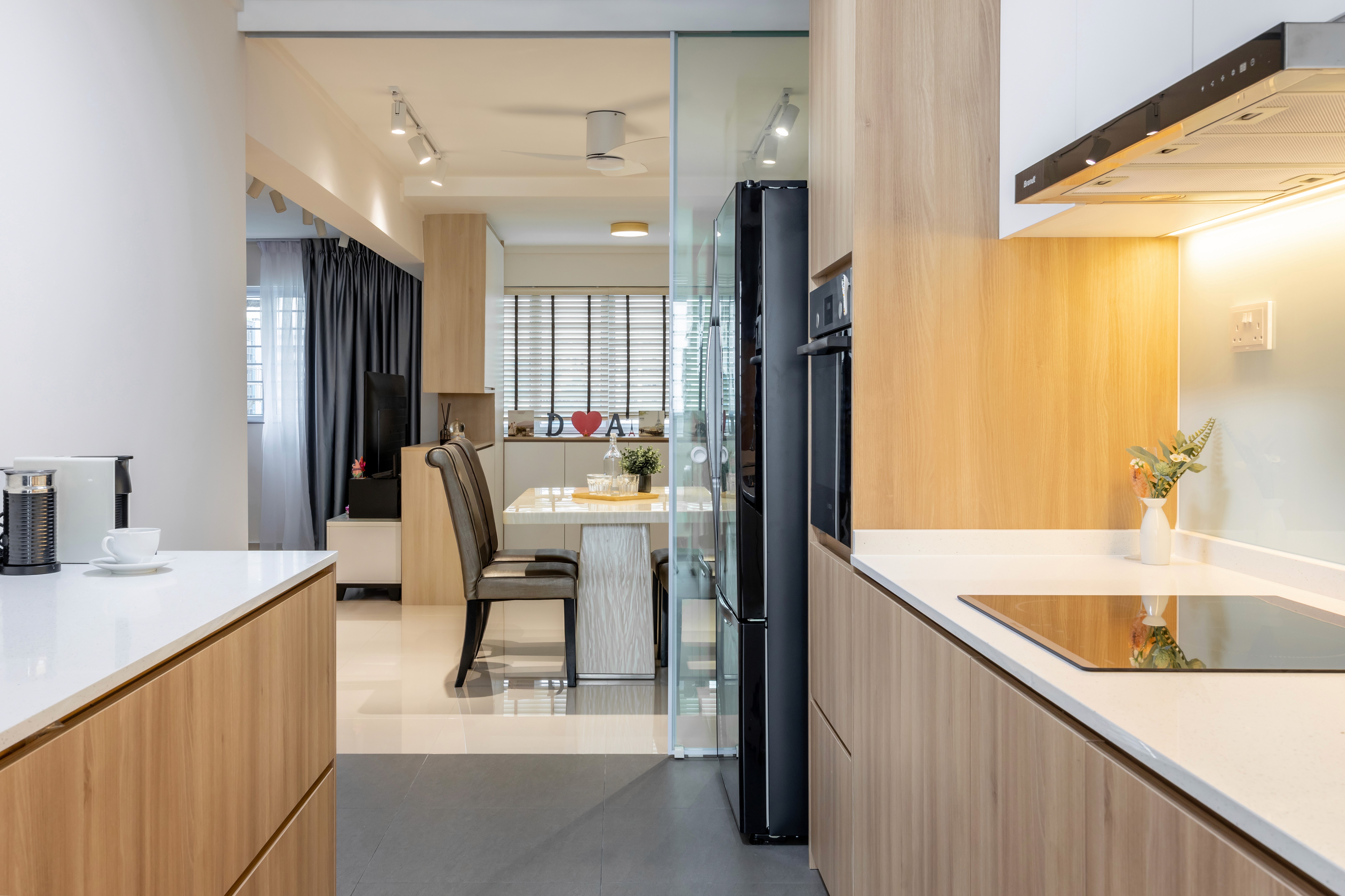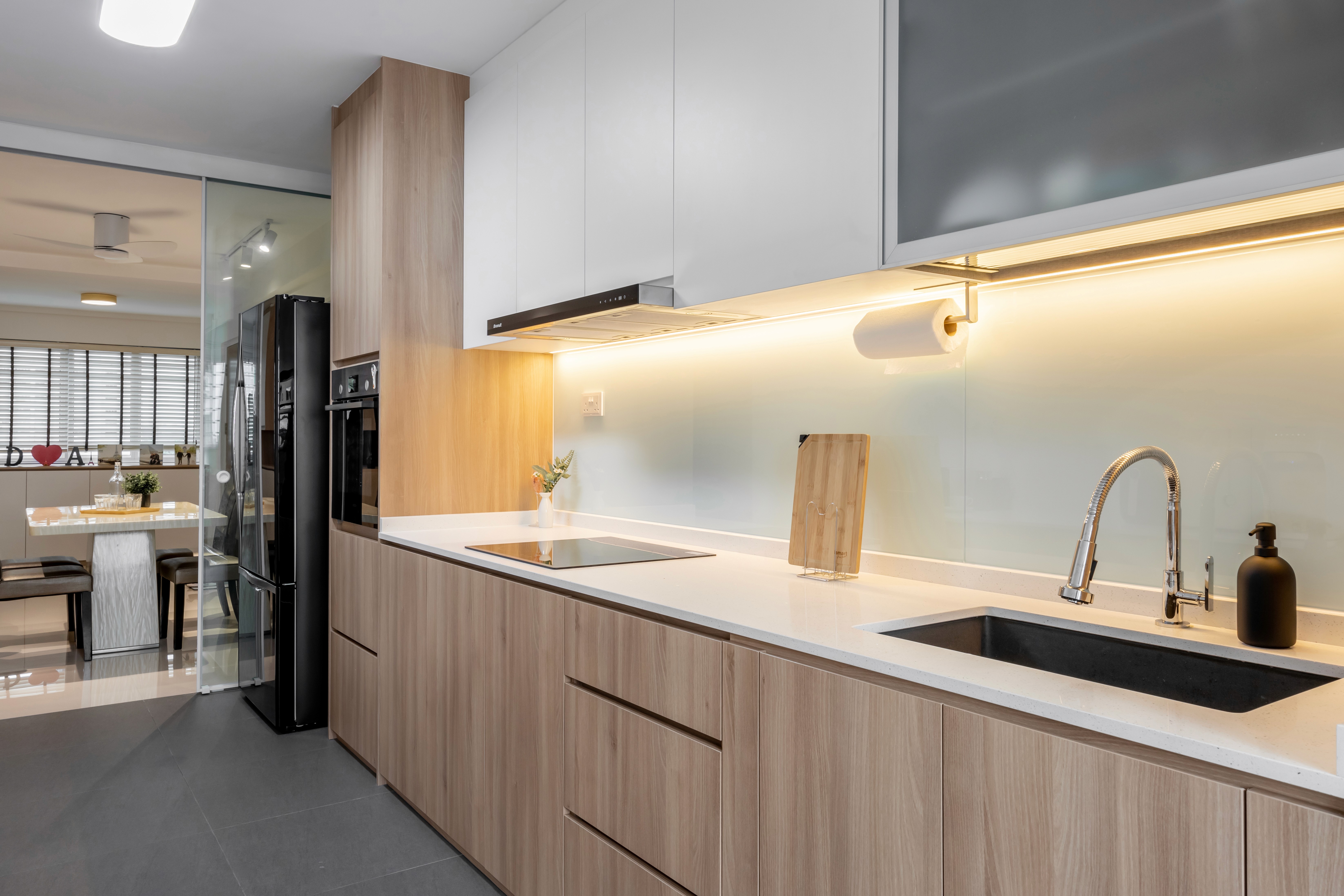 A minimalist palette of crisp white and natural light wood grains creates a bright, warm, and inviting space. Sunlight reflects off white surfaces, enhancing openness, while light wood cabinetry, and accents add warmth and texture. The design and layout are practical and easy to maintain, with seamless storage keeping spaces clutter-free and serene.