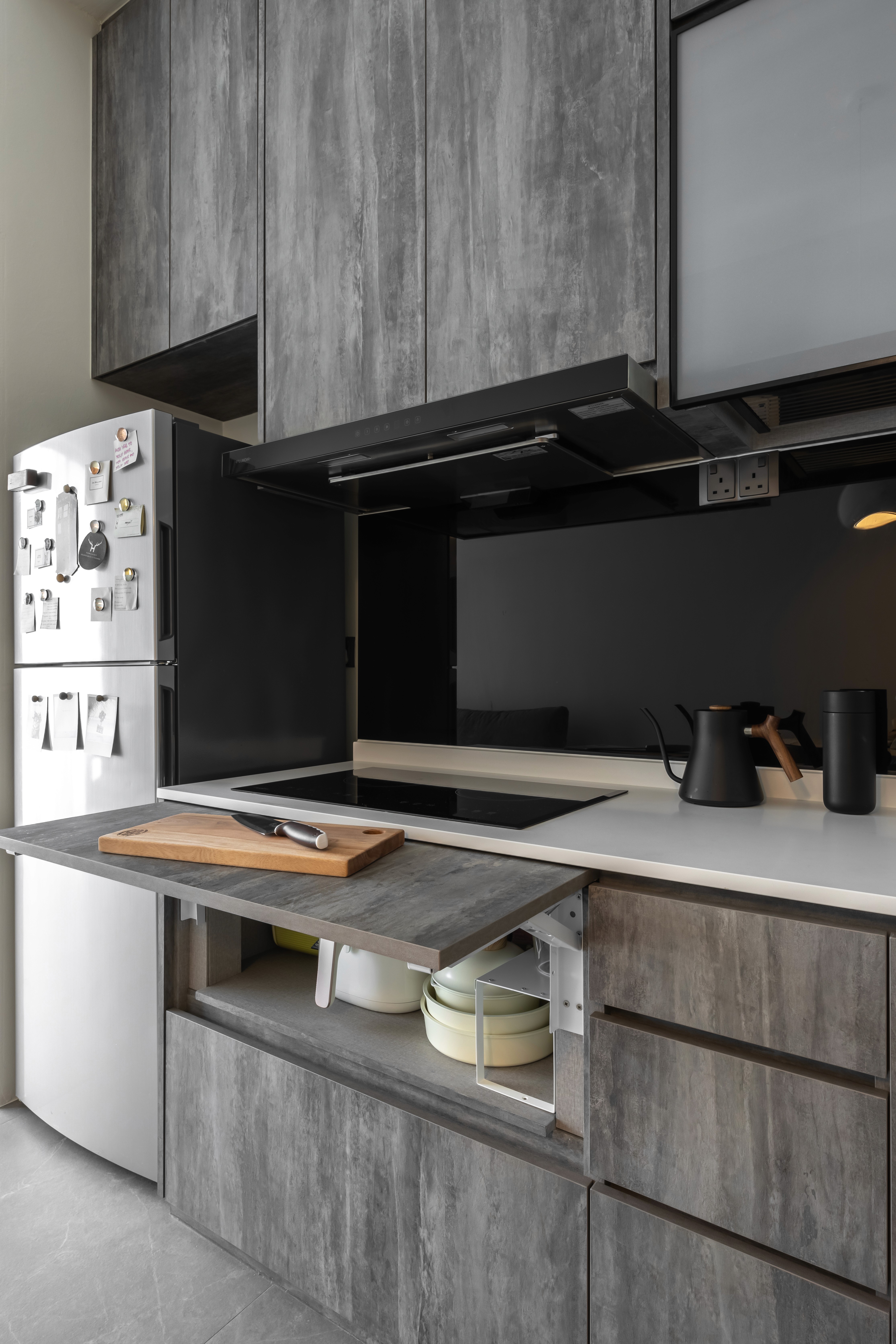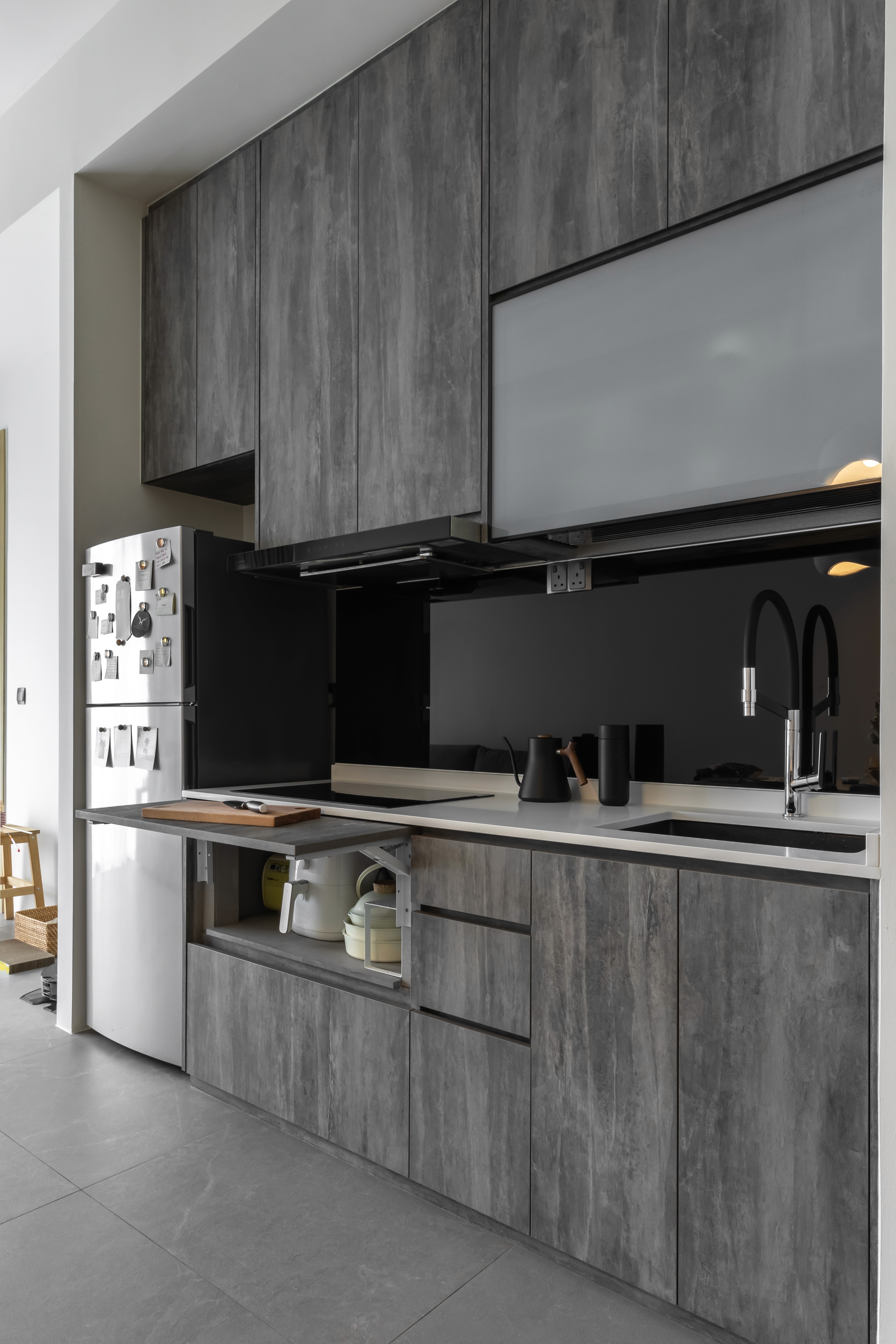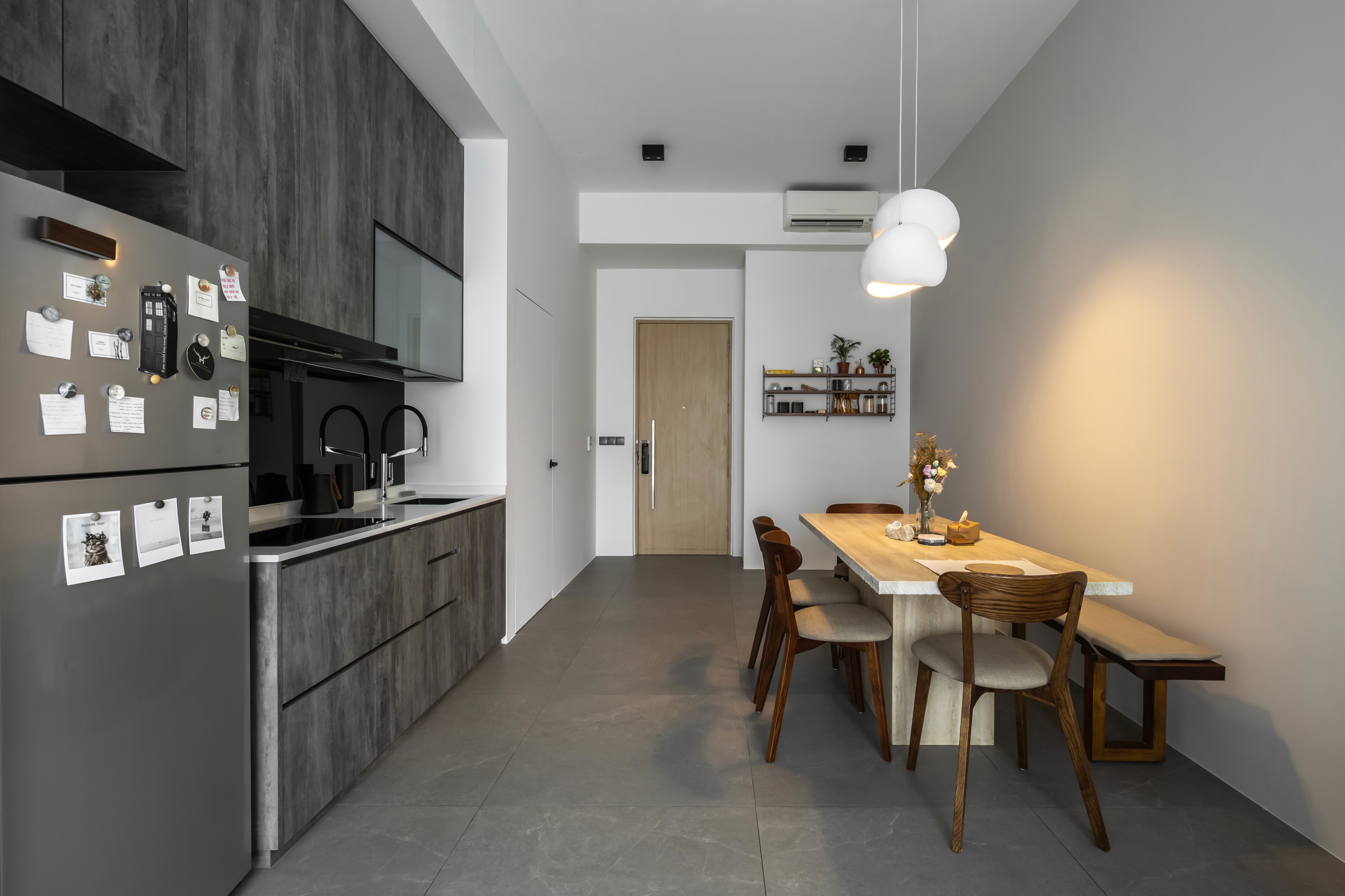 The overall aesthetic harmonizes dark elegance with natural brightness, resulting in a contemporary interior that is timeless, cozy, and refined.