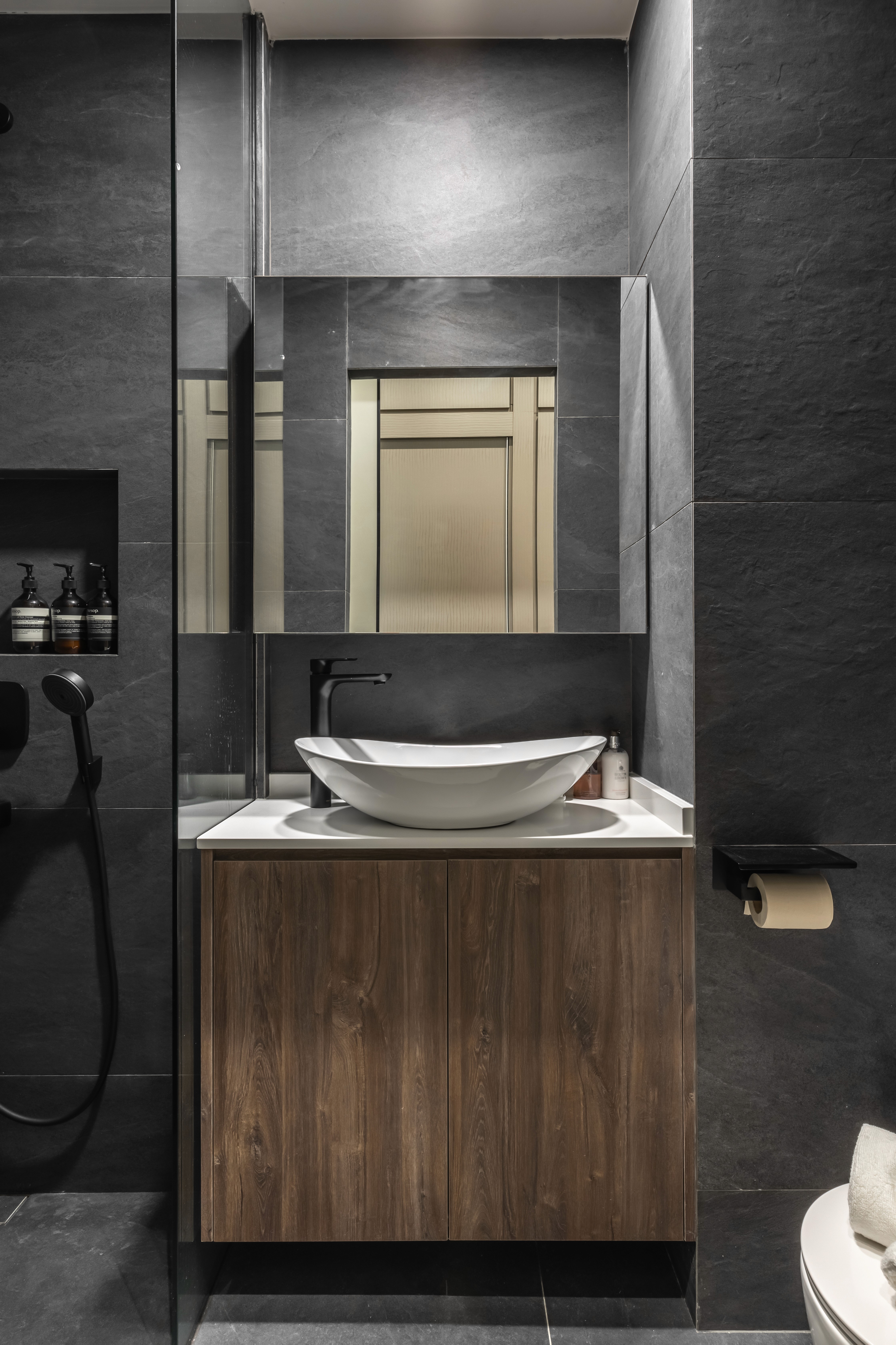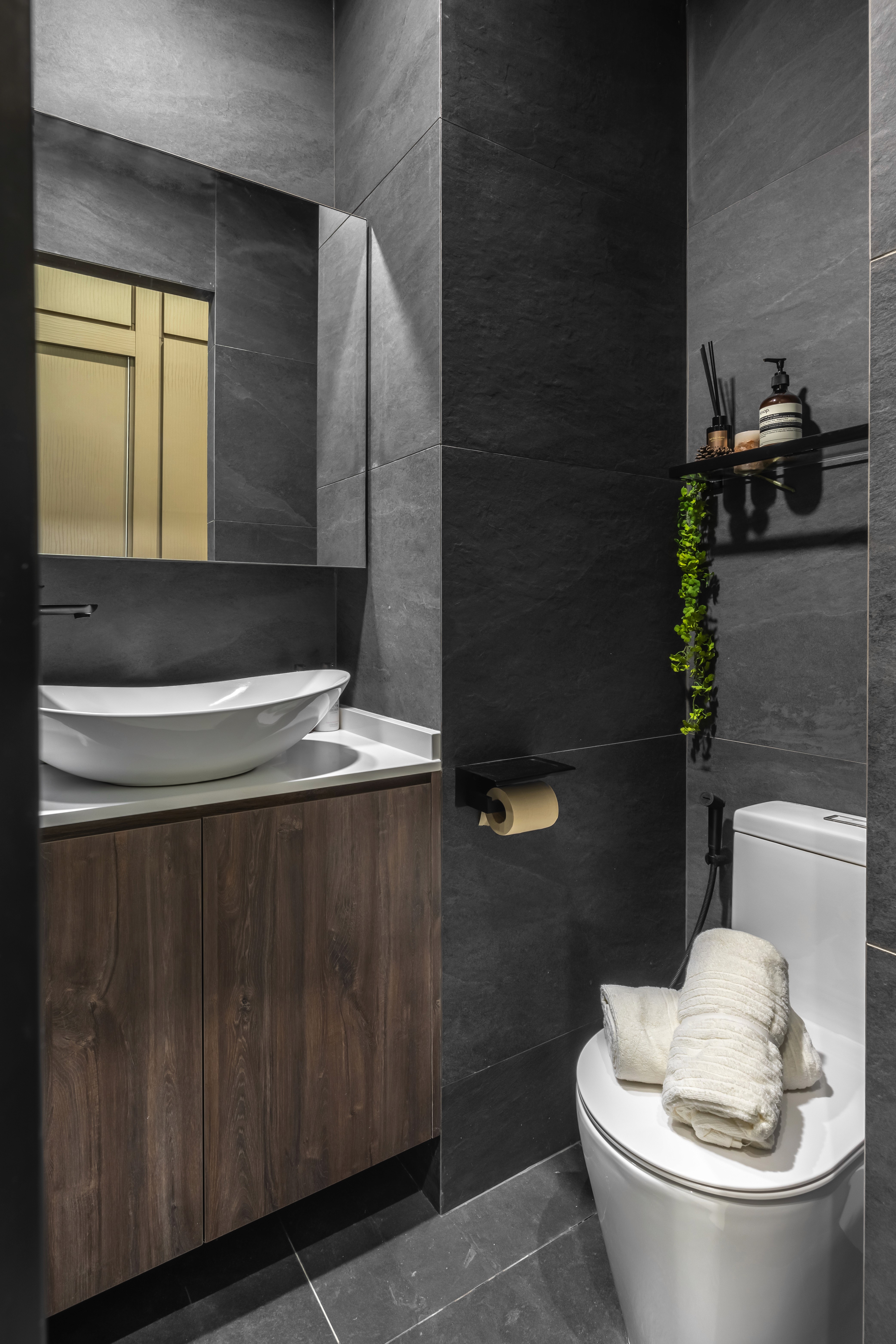 In the bathrooms, deep colors enhance a sense of luxury. Dark cabinetry, stone finishes, and elegant fixtures contrast beautifully with natural textures, making the space feel indulgent yet serene.