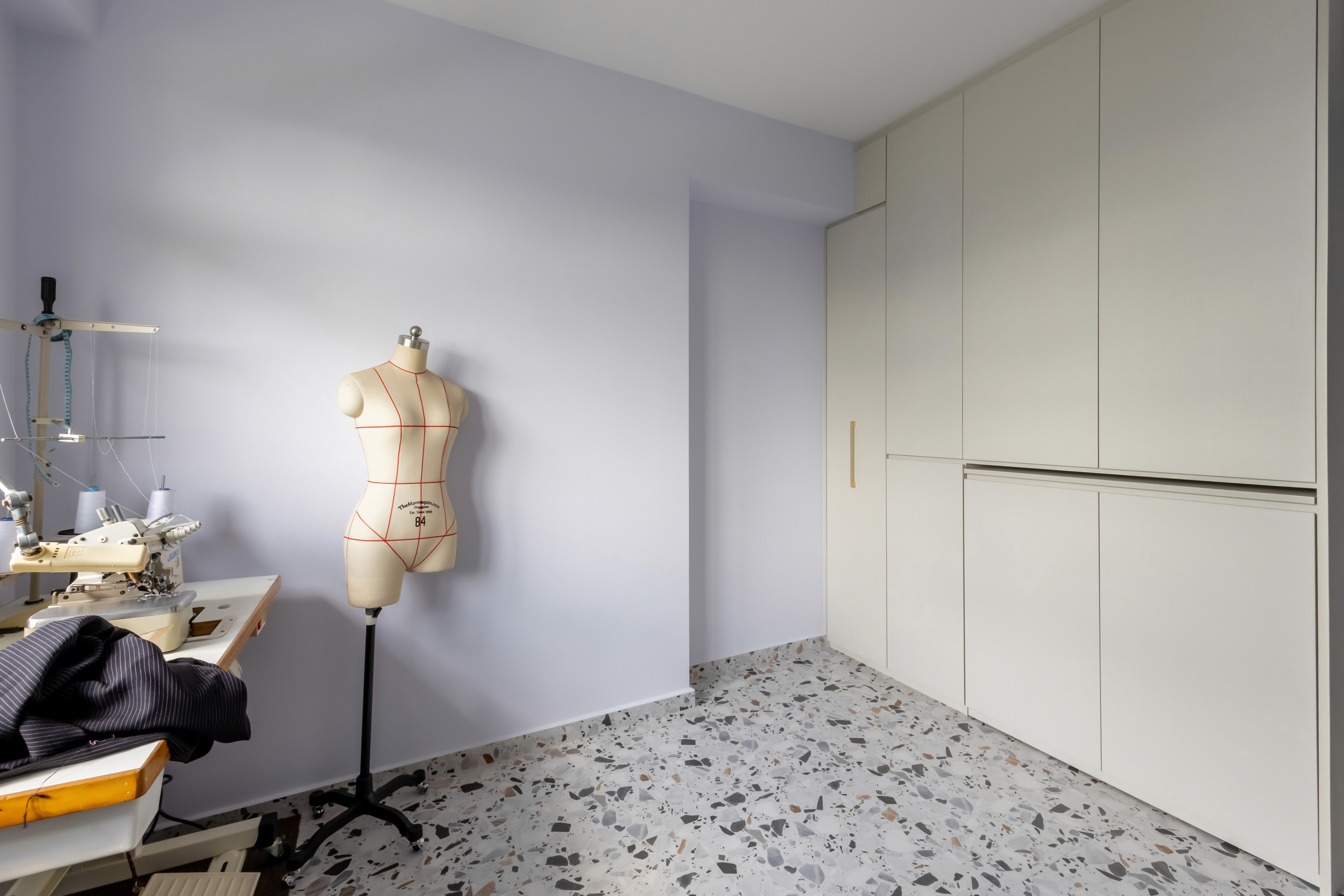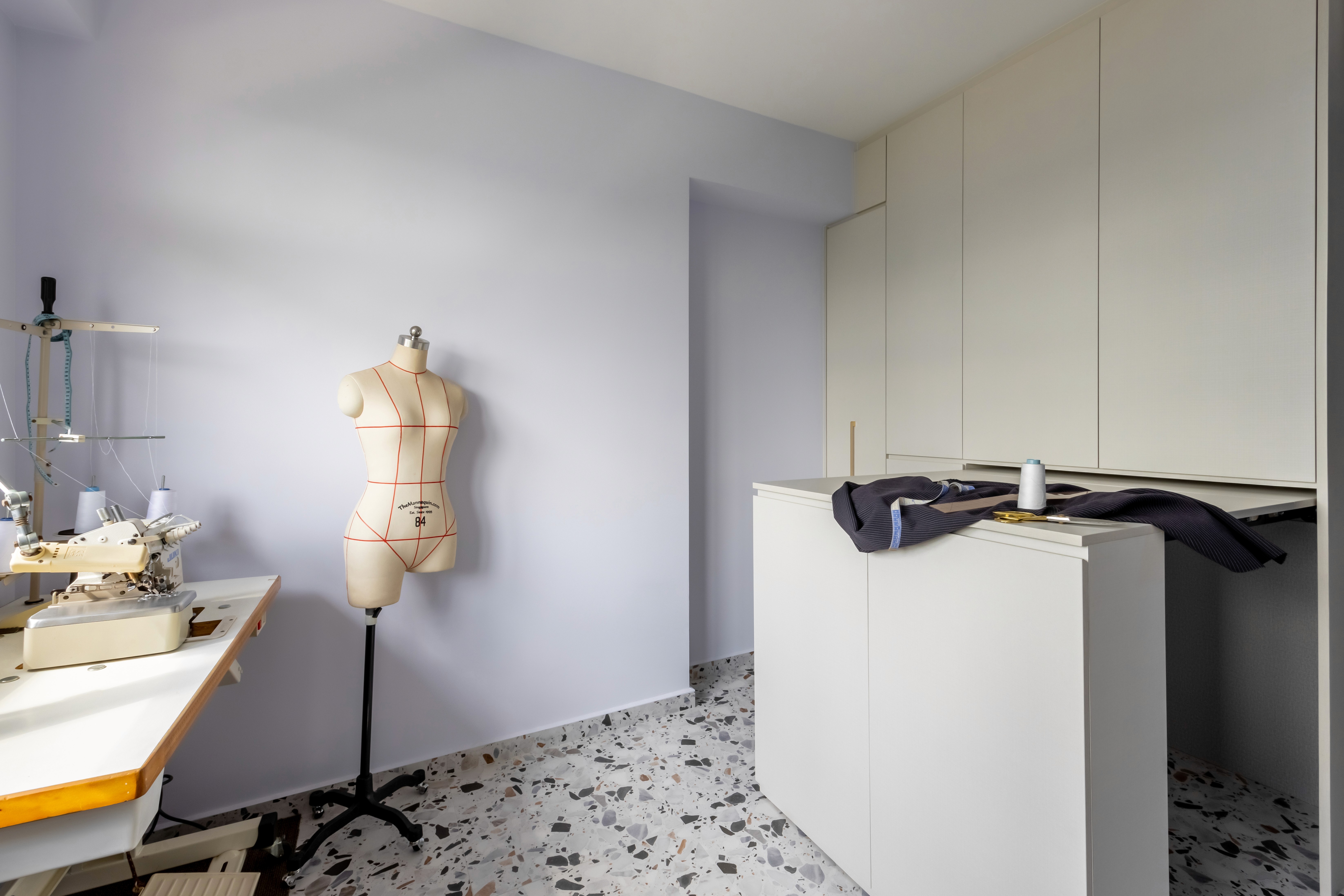 Practicality is key: durable, easy-to-maintain surfaces ensure the home stays polished and livable. A dedicated sewing room blends creativity with organization. A large table can be tucked away when not in use, and ample storage keeps fabrics and tools neatly arranged, minimizing clutter.