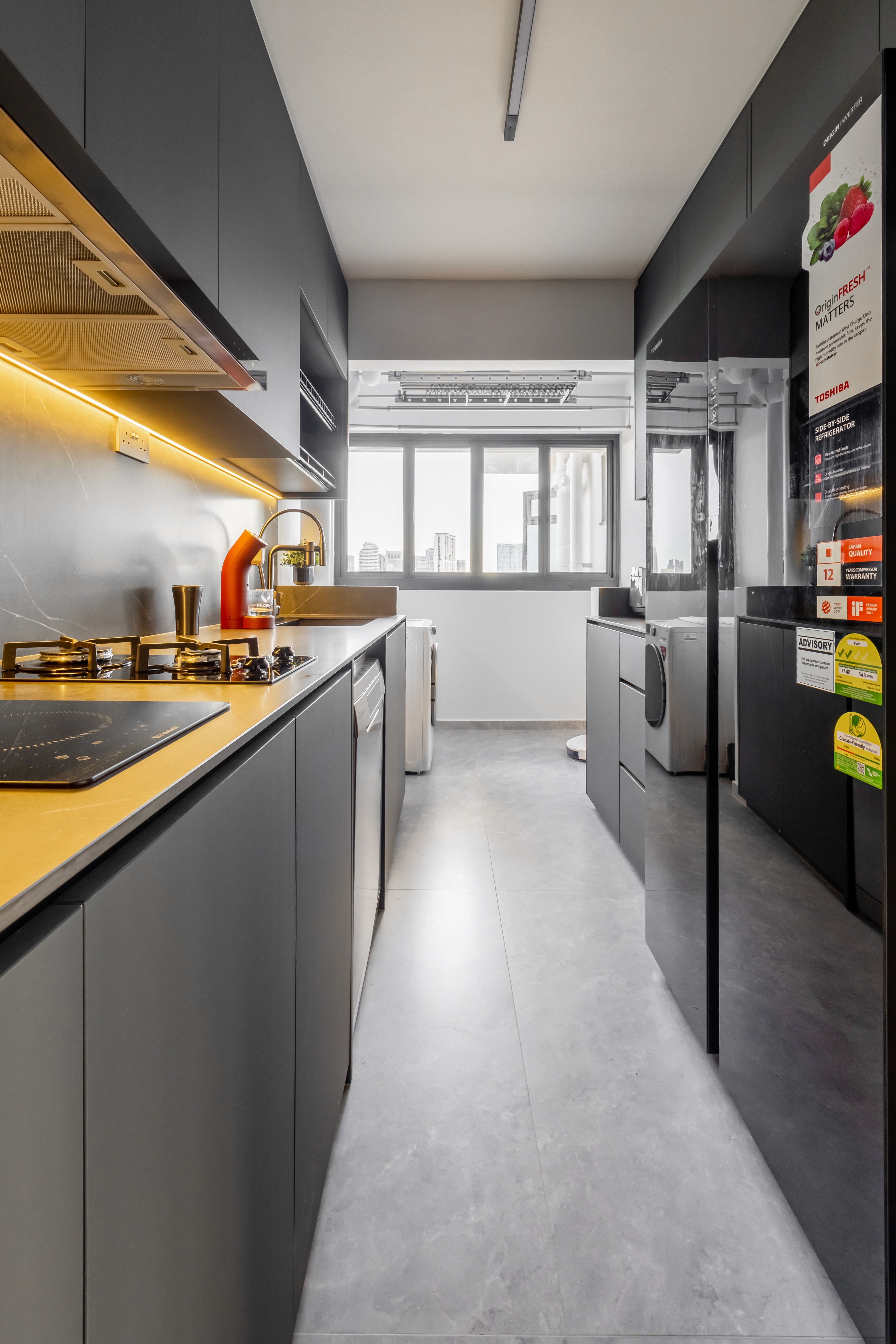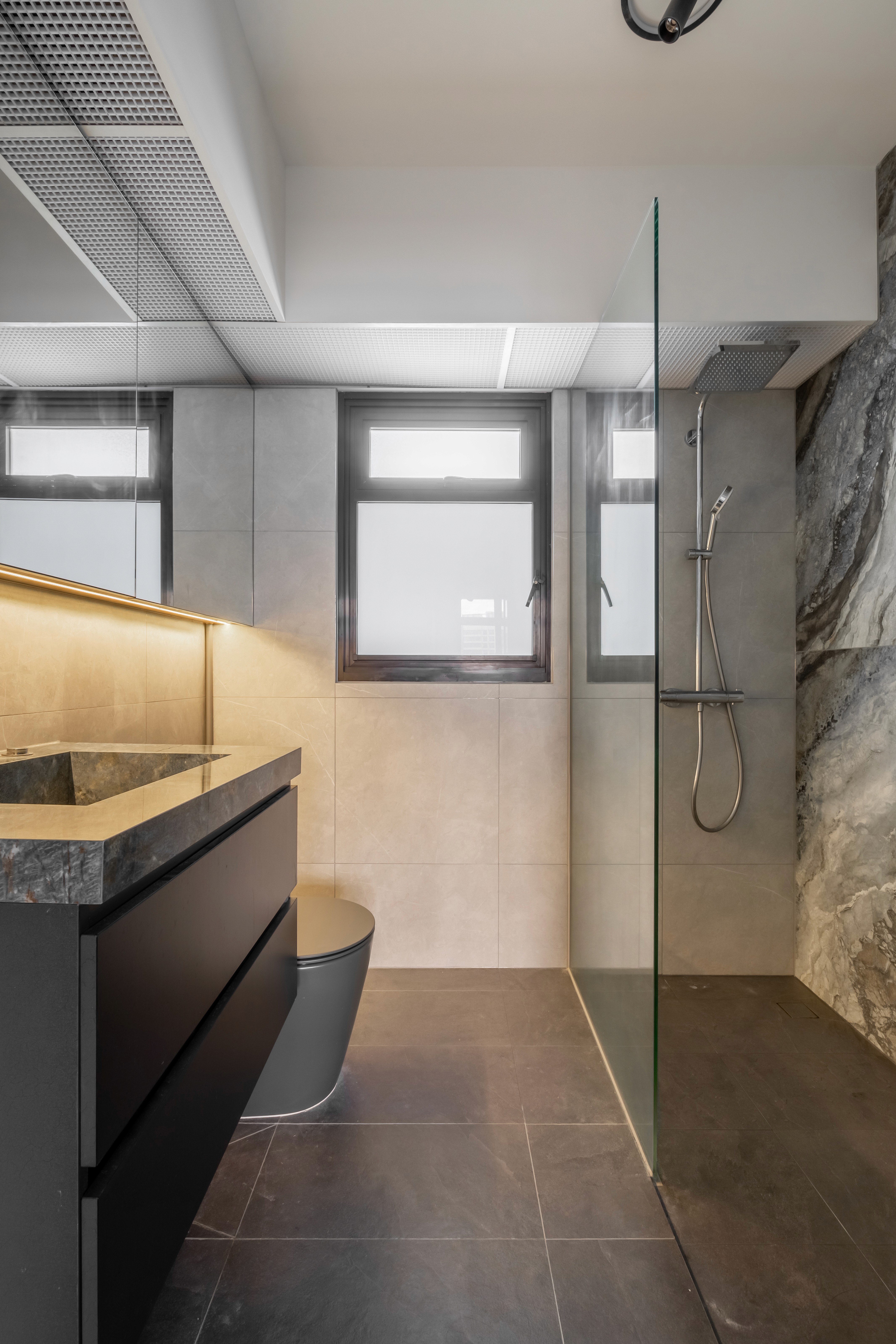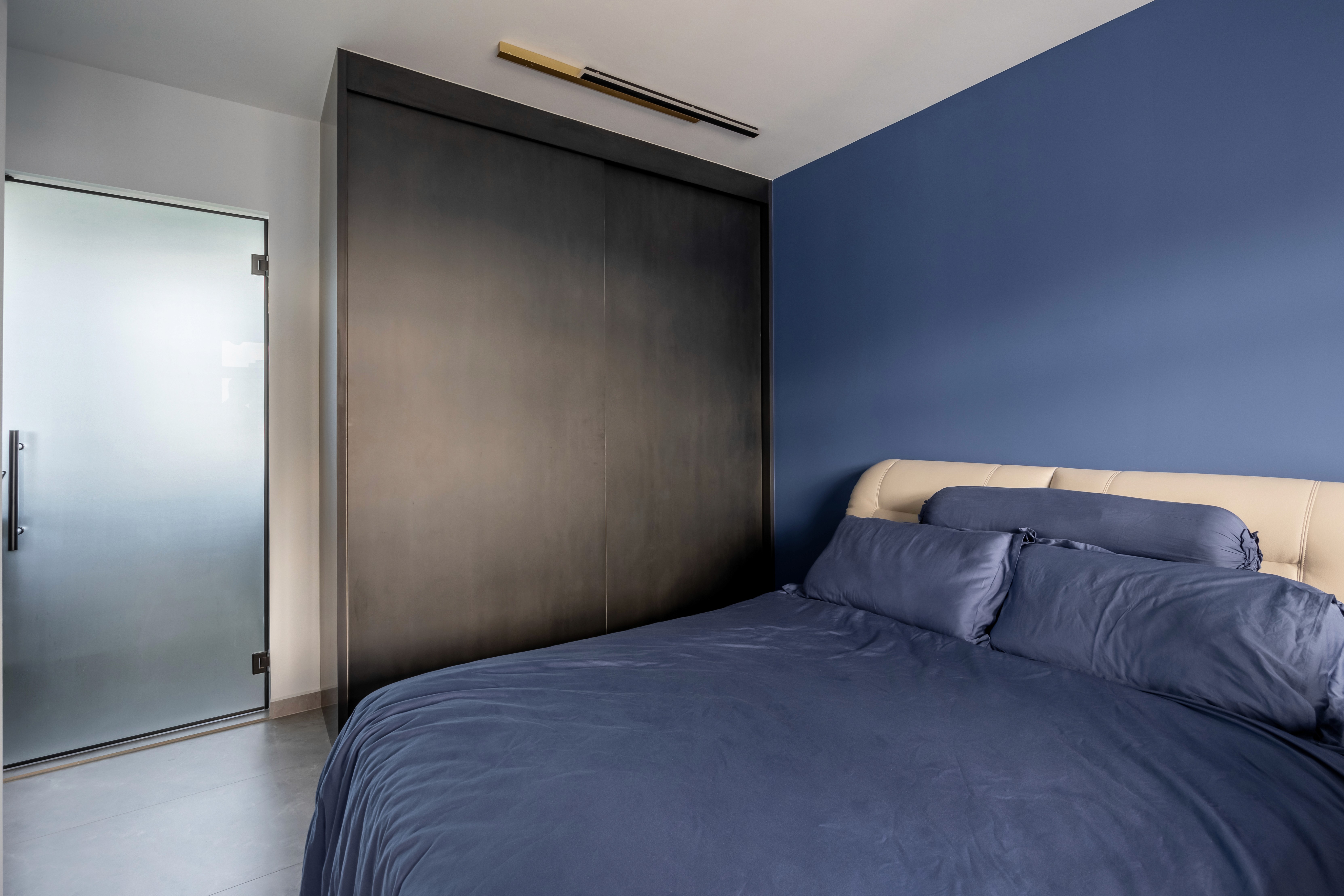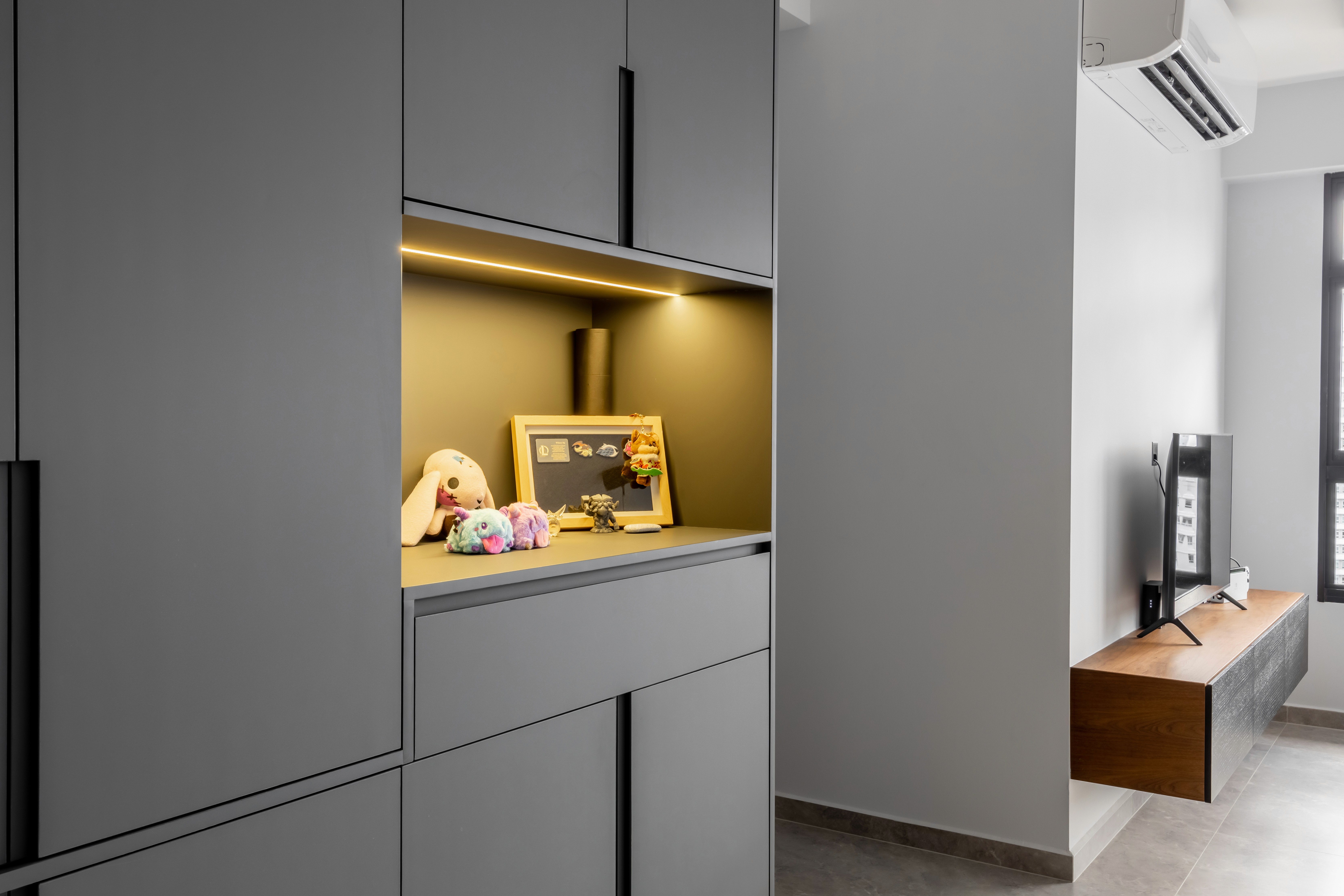 A home that centers around a repeated shade of grey, creating a calm, cohesive foundation, while carefully chosen accent colors add warmth and personality. Thoughtful lighting and reflective surfaces keep the interiors bright and inviting, proving that darker tones can feel both elegant and airy.
